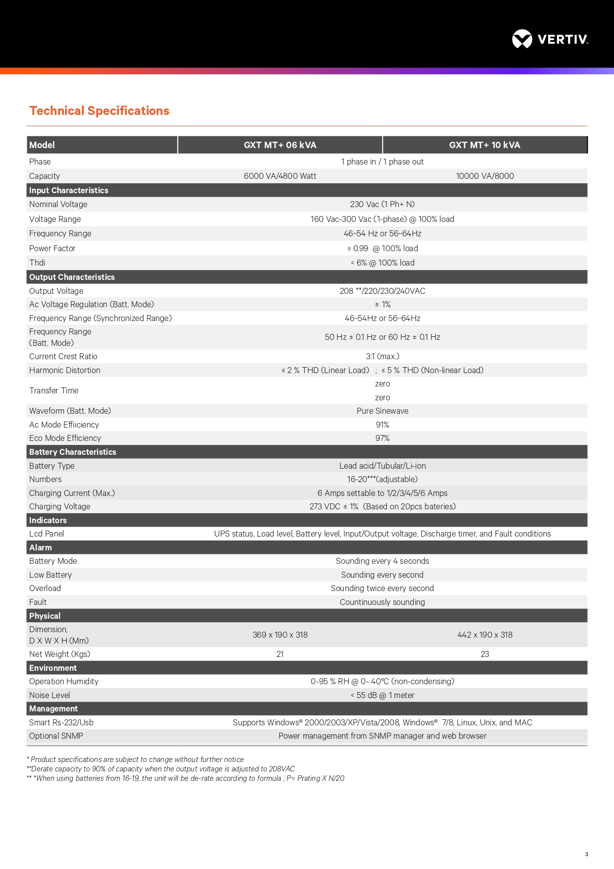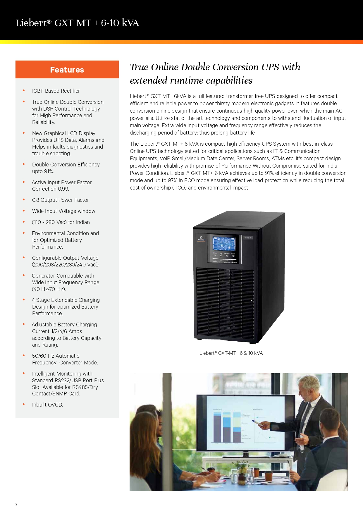 The Liebert GXT-MT+ 10 kVA is compact high efficiency UPS System with best-in-class Online UPS technology suited for critical applications such as IT & Communication Equipments, VoIP, Small/Medium Data Center, Server Rooms, ATMs etc.  Liebert GXT MT+ 10 kVA achieves up to 91% efficiency in double conversion mode and up to 97% in ECO mode ensuring effective load protection while reducing the total cost of ownership (TCO) and environmental impact